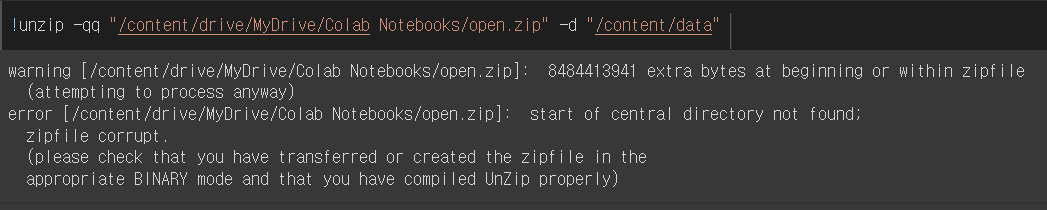 colab 환경에서 unzip 하려고 할 때 다음과 같은 에러가 떠서 해결하고자 gpt에게 물어봤는데