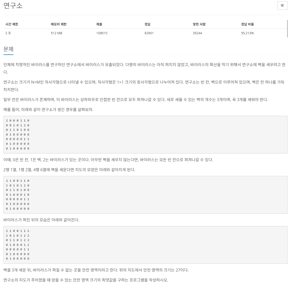 이 문제는 바이러스가 유출된 연구소에서 벽을 세워 바이러스의 확산을 막고, 안전 영역의 최대 크기를 구하는 것이 목표이다.