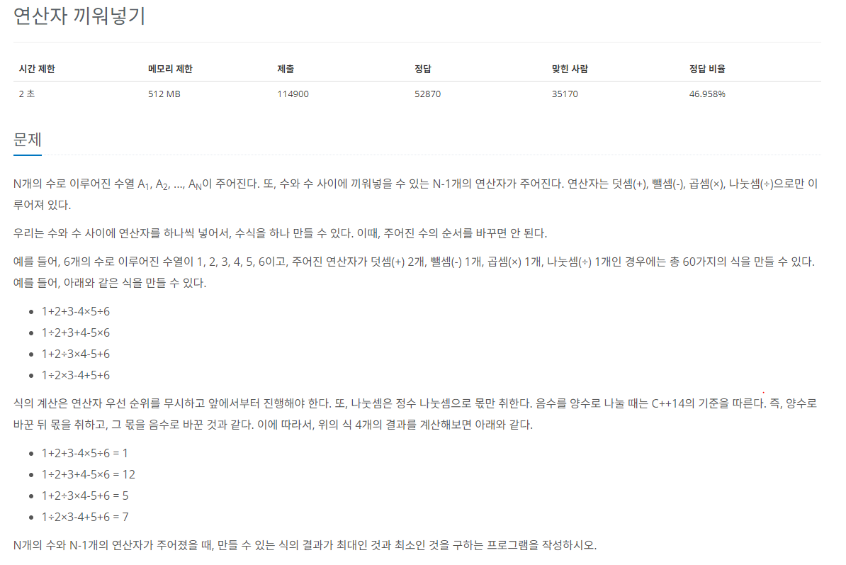 이 문제는 가능한 모든 연산자 배치를 시도하여 결과의 최댓값과 최솟값을 찾는 백트래킹(DFS) 문제입니다.
