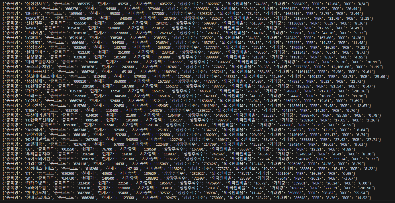 {'종목명': '삼성전자', '종목코드': '005930', '현재가': '58300', '시가총액': '3480383', '상장주식수': '5969783', '외국인비율': '52.64', '거래량': '22327882', 'PER': '14.25', 'ROE': '4.15'}