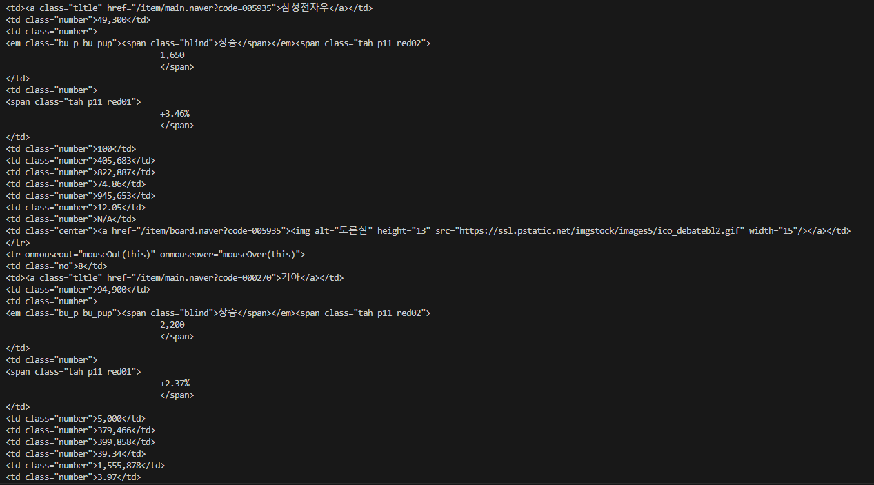 다음과 같이 종목마다 tr td로 표시되어있는것을 확인할수있다.