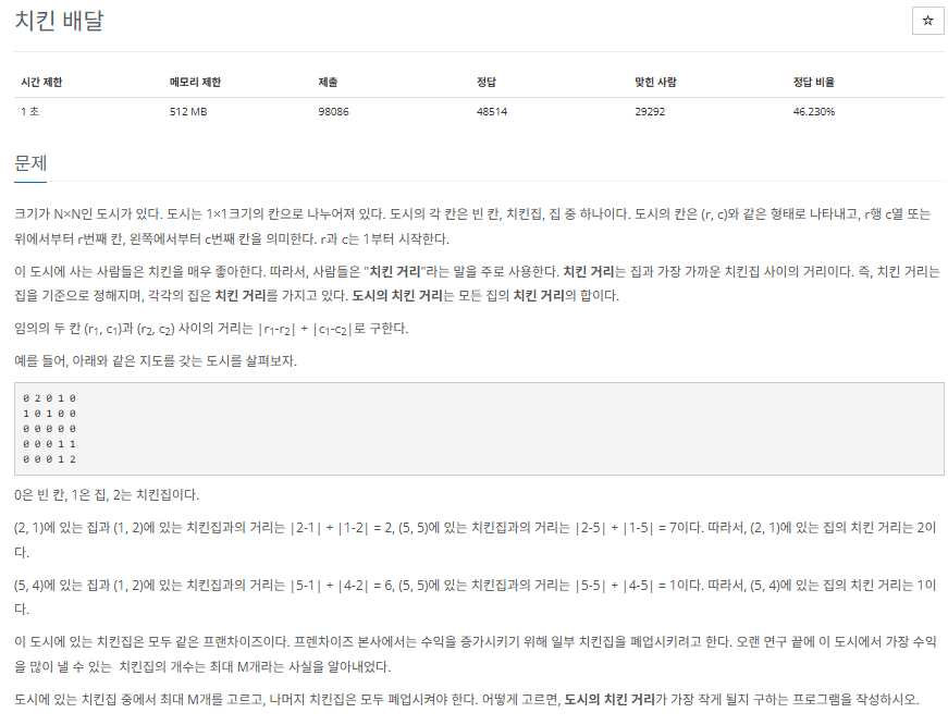 - 폐업시키지 않을 M개의 치킨집을 선택하여 도시의 치킨 거리를 최소화하는 것