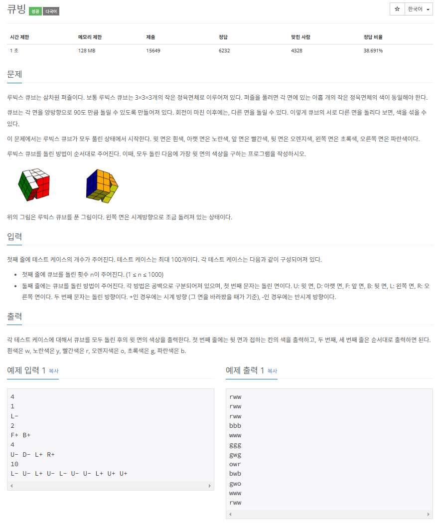 5373 큐빙 문제 제출 결과