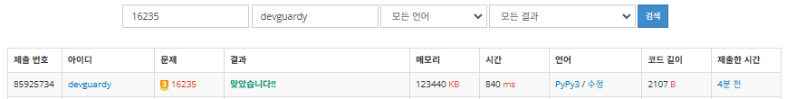 - Python3가 아닌 시간초과를 피하기 위해 PyPy3로 진행해야 합니다.