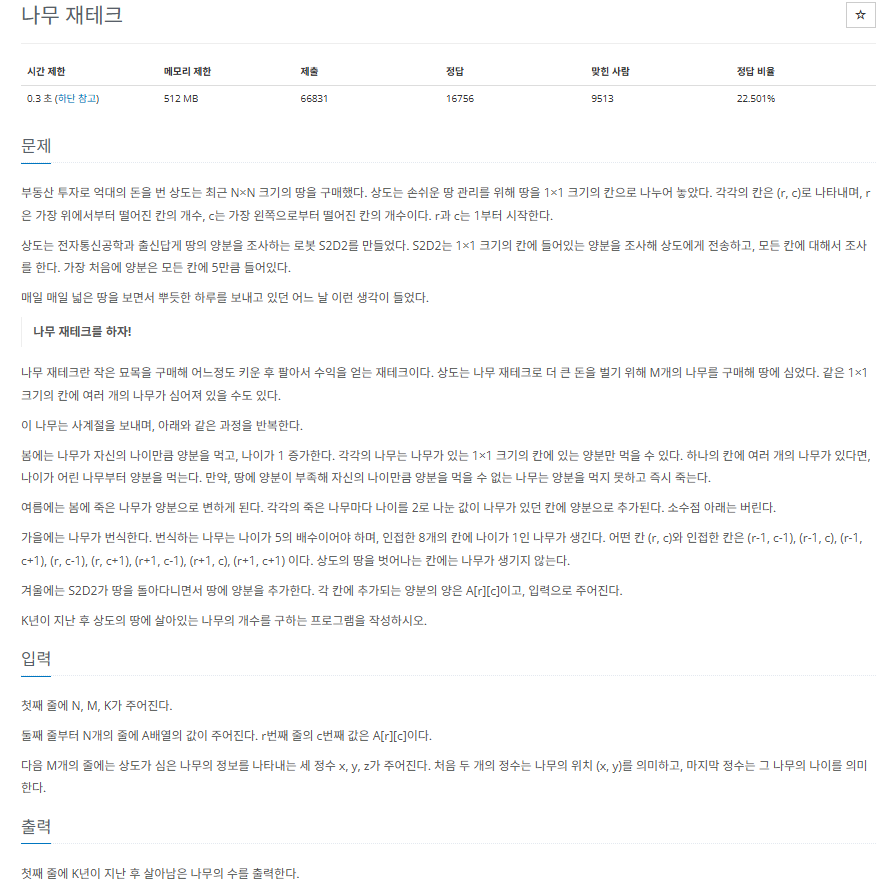 이 문제는 시뮬레이션 문제로, 각 년도마다 계절별로 나무와 땅의 상태를 업데이트해야 한다. N이 최대 10이므로 전체 땅의 크기는 최대 10×10이다. 하지만 K가 최대 1000이므로, 연산을 효율적으로 수행해야 한다.