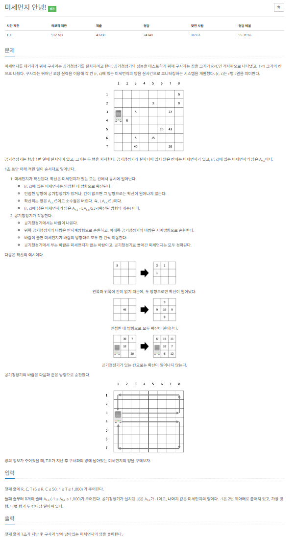 이 문제는 시뮬레이션 문제이다. 각 시간마다 미세먼지의 확산과 공기청정기의 작동을 구현해야 한다.