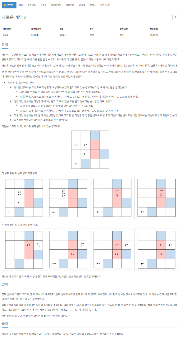 이 문제는 시뮬레이션 문제로, 주어진 규칙에 따라 게임을 구현해야 한다. 말들의 위치와 스택 상태를 관리하면서, 매 턴마다 말들을 이동시키고, 말이 4개 이상 쌓이는지 확인해야 한다.