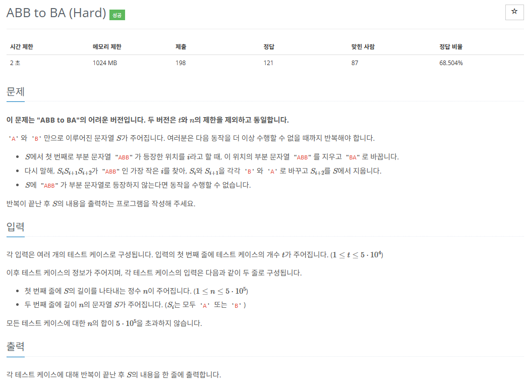 이 문제는 문자열에서 특정 패턴("ABB")을 찾아 변환하는 작업을 반복적으로 수행해야 한다. 그러나 문자열의 길이가 최대 5×10^5이므로 단순한 탐색으로는 시간 초과가 발생한다.