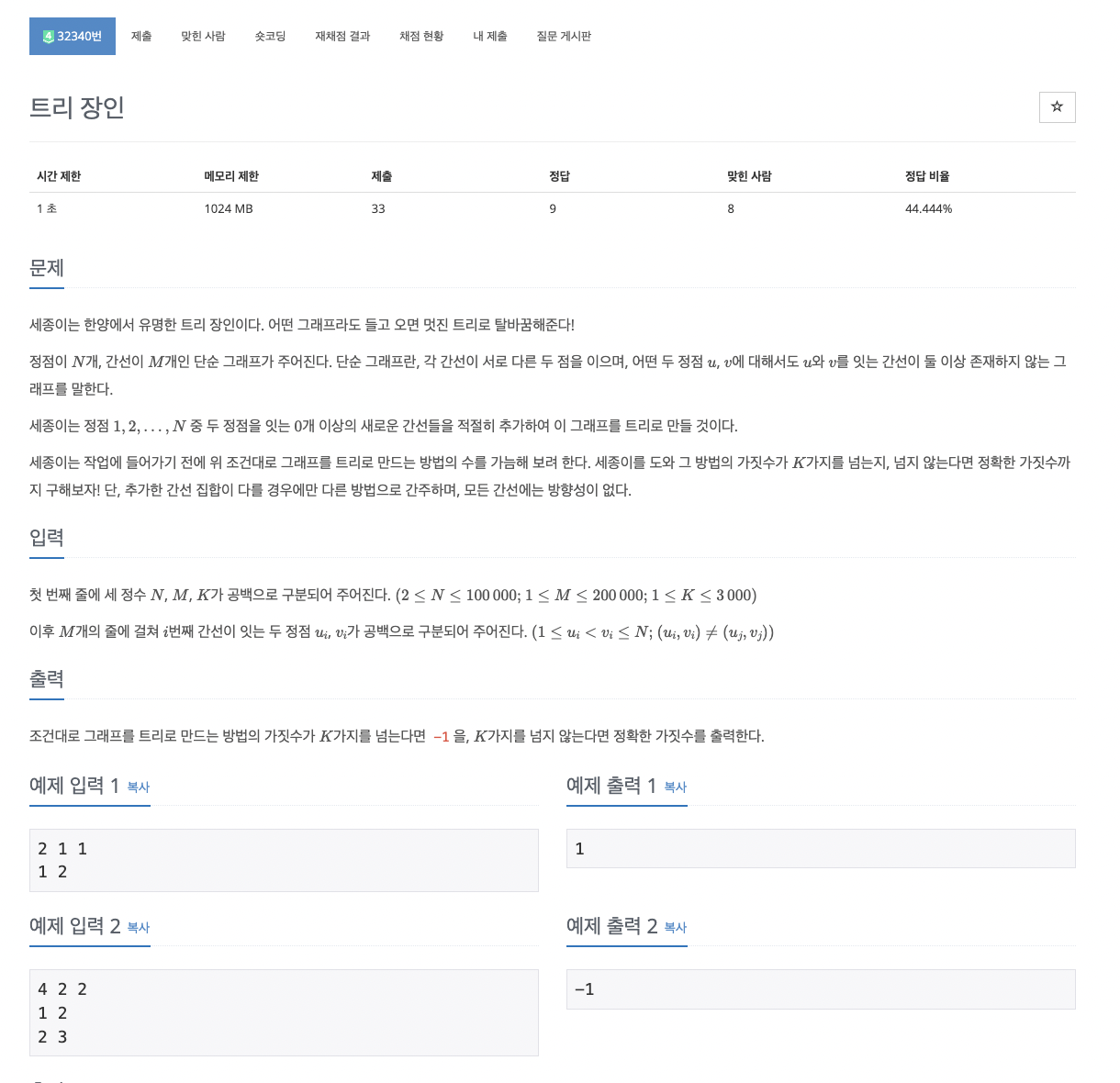 세종이는 정점 N개와 간선 M개로 이루어진 단순 그래프를 가지고 있다. 그는 이 그래프에 0개 이상의 간선을 추가하여 트리로 만들려고 한다. 간선을 추가할 수 있지만 기존의 간선을 제거할 수는 없다. 간선을 추가하는 방법의 가짓수를 구하고, 그 수가 K를 넘으면 −1을 출력하고, 그렇지 않으면 정확한 가짓수를 출력하는 문제다.