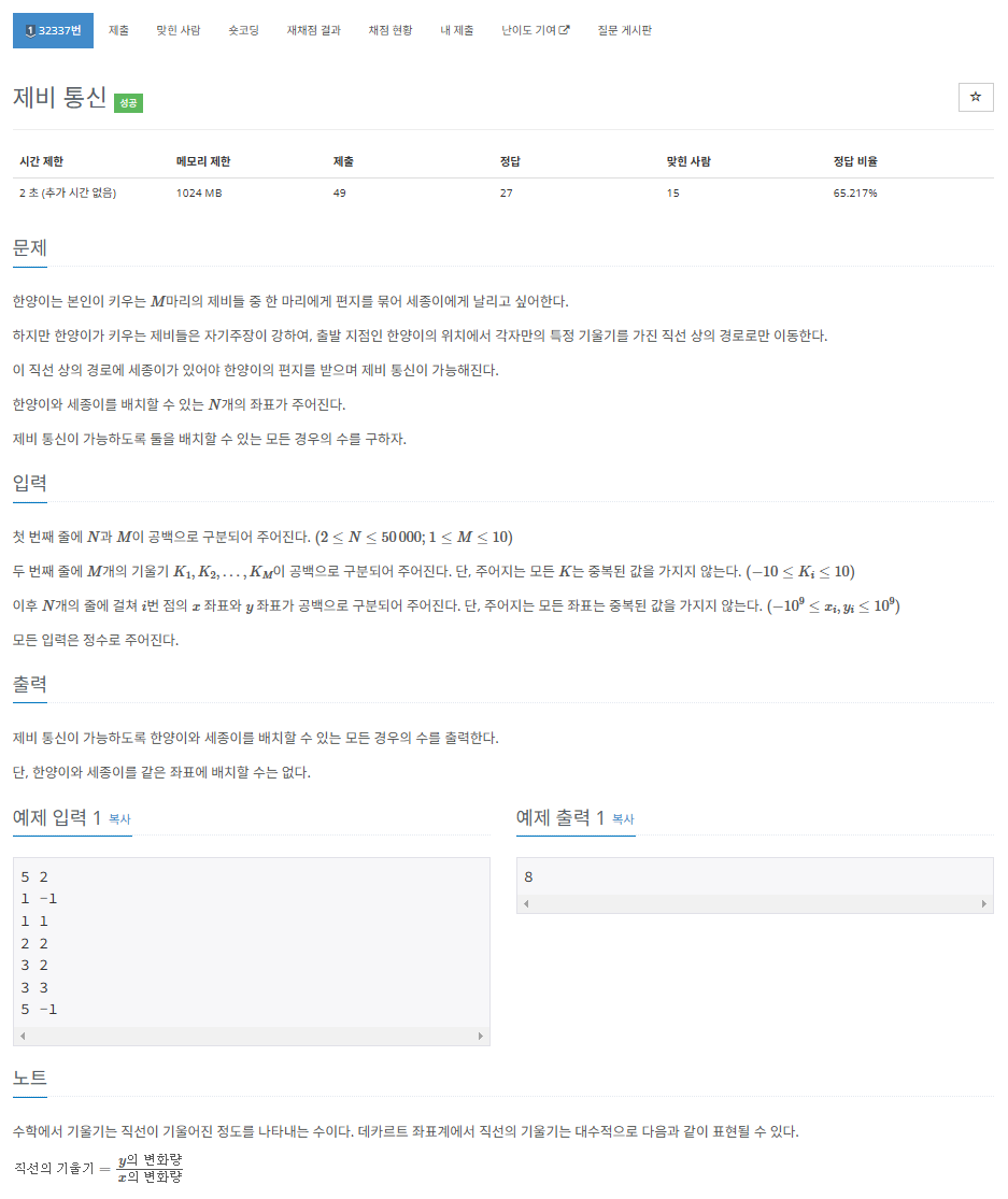 이렇게 구현하면 시간 복잡도는 O(M×N)이며, N과 M의 최대 값이 각각 50,000과 10이므로 충분히 빠르게 동작한다. 또한, 좌표와 기울기가 정수이므로 부동소수점 오차 없이 정확한 계산이 가능하다.