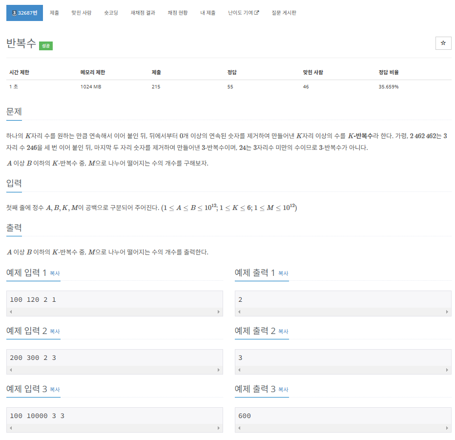 하나의 K자리 수를 원하는 만큼 연속해서 이어 붙인 뒤, 뒤에서부터 개 이상의 연속된 숫자를 제거하여 만들어낸 K자리 이상의 수를 K-반복수라고 한다. 이상 B 이하의 K-반복수 중에서 M으로 나누어떨어지는 수의 개수를 구하는 문제이다.