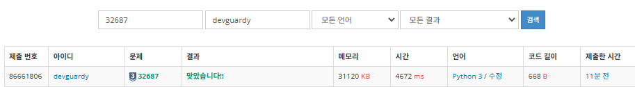 5. 백준 32687 제출 결과