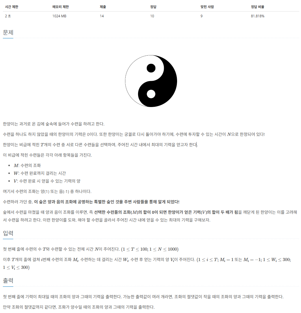 한양이는 최대한 많은 기력을 얻고자 한다. 그는 수련의 조화 합이 0이 되면, 즉 양과 음이 균형을 이루면 총 기력이 두 배가 된다는 것을 알고 있다. 따라서, 각 수련을 선택하여 전체 시간 제한 내에서 최대의 기력을 얻는 것이 목표이다.