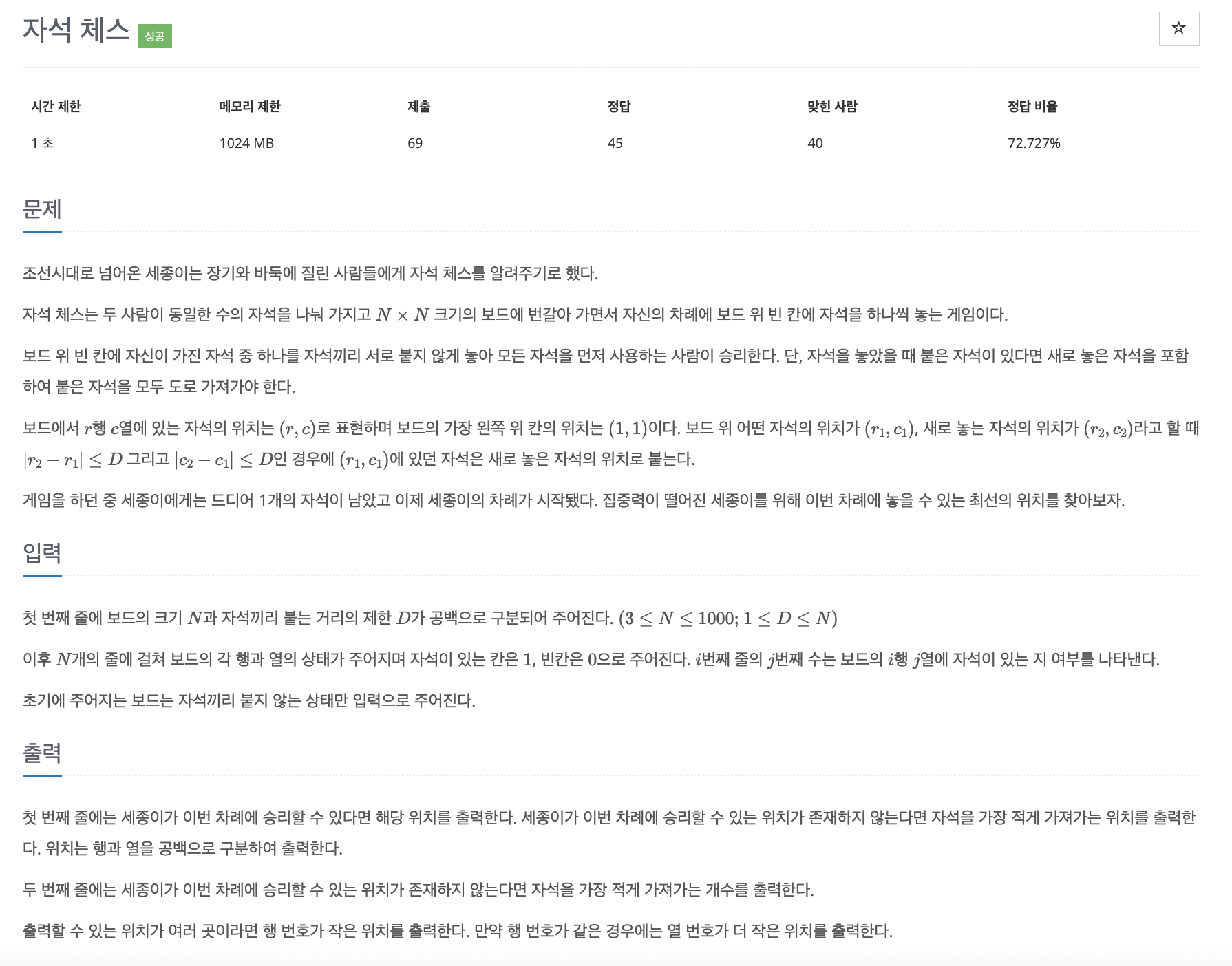 - 승리할 수 있는 위치가 없다면, 가져가야 할 자석의 개수가 최소인 위치를 동일한 방식으로 출력하고, 그 개수를 출력한다.