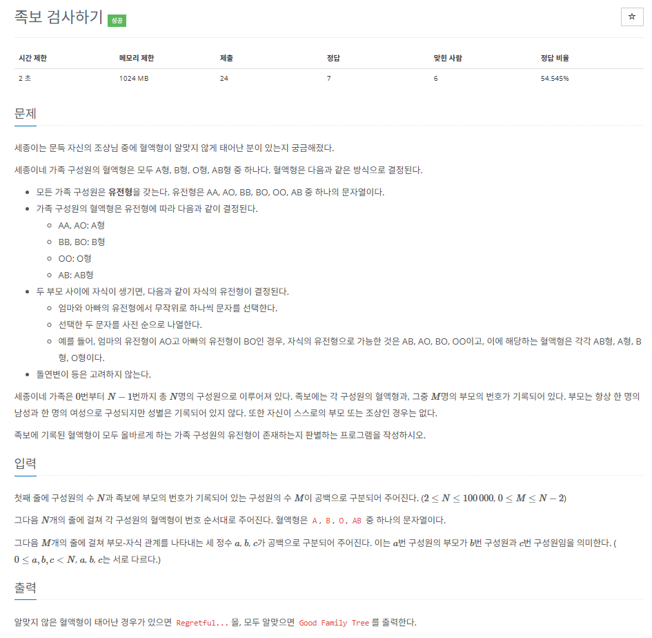 - 만약 불가능한 혈액형이 있다면 "Regretful..."을 출력하고, 그렇지 않으면 "Good Family Tree"를 출력한다.