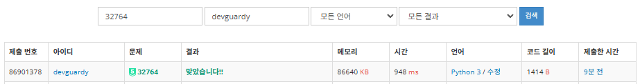 5. 백준 32764 울려퍼져라 문제 파이썬(python) 제출 결과