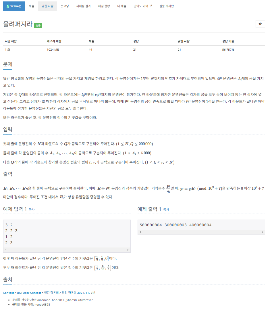 - 기댓값 가 기약분수 𝑝𝑖/𝑞𝑖일 때, 𝑝𝑖≡𝑞𝑖𝐸𝑖(mod10^9+7)을 만족하는 0≤pi<10^9+7인 정수를 출력한다.