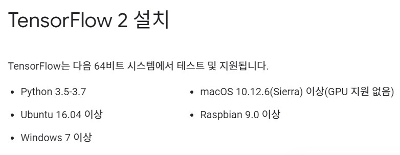 Tensorflow는 다음 환경에서 지원된다. - 출처