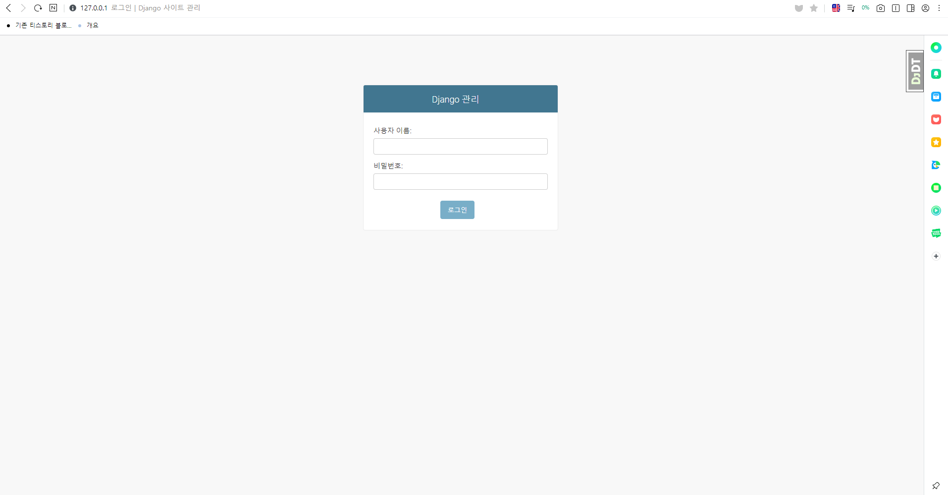 설정 후 http://127.0.0.1:8000/admin/ 에 들어가면 다음과 같은 화면이 나온다.