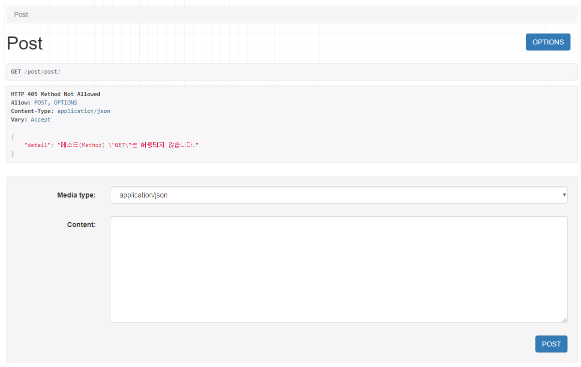 저장 후 http://127.0.0.1:8000/post/post/ url 접속 시 다음과 같은 화면이 뜬다.