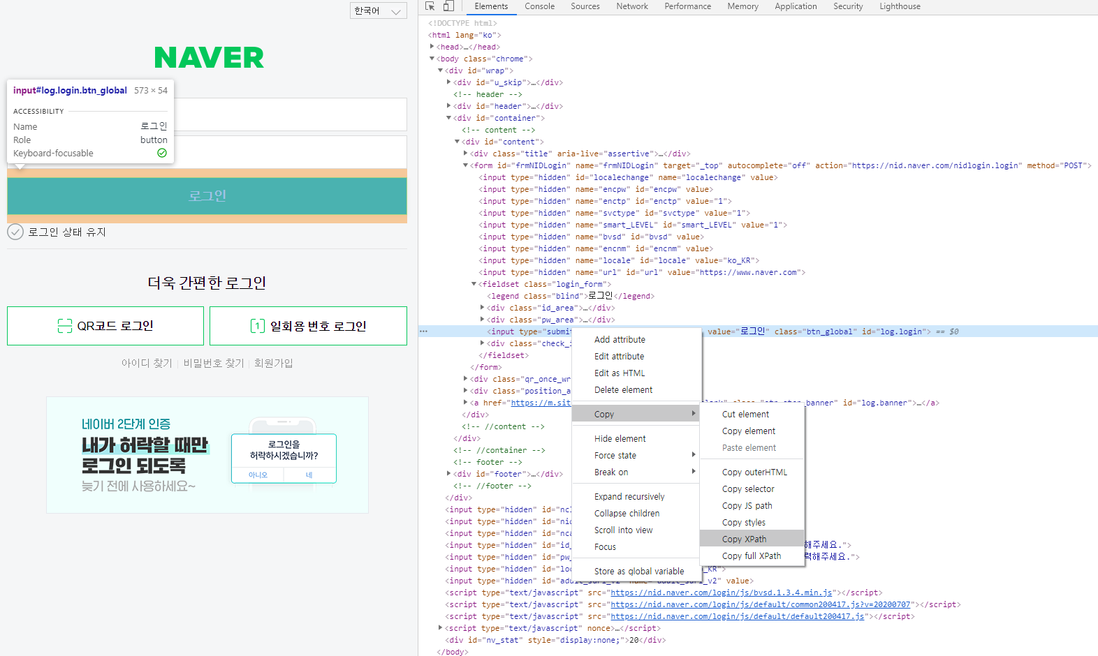 로그인 버튼에 대한 xpath는 개발자도구를 이용하여 얻을 수 있다.