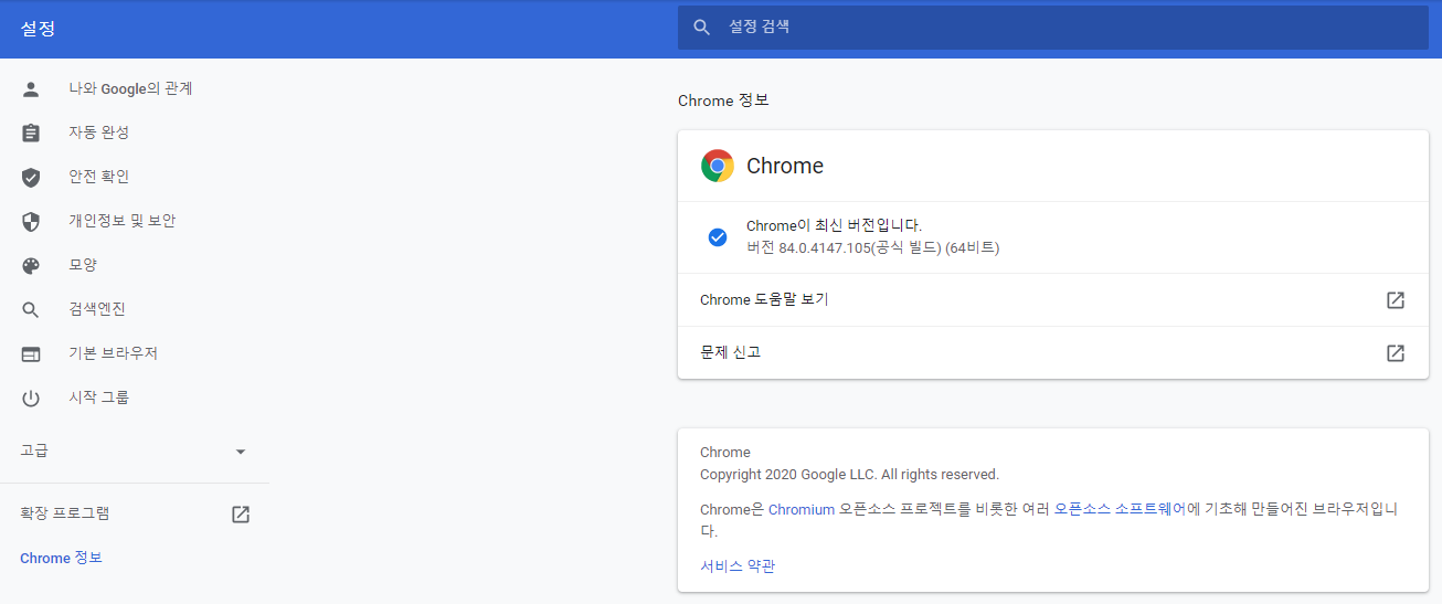 설정 -> Chrome 정보 -> 버전 확인