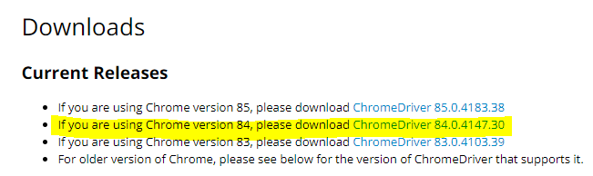 84.0.4147 버전이므로 크롬 드라이버 사이트에서 해당하는 버전을 다운받는다.