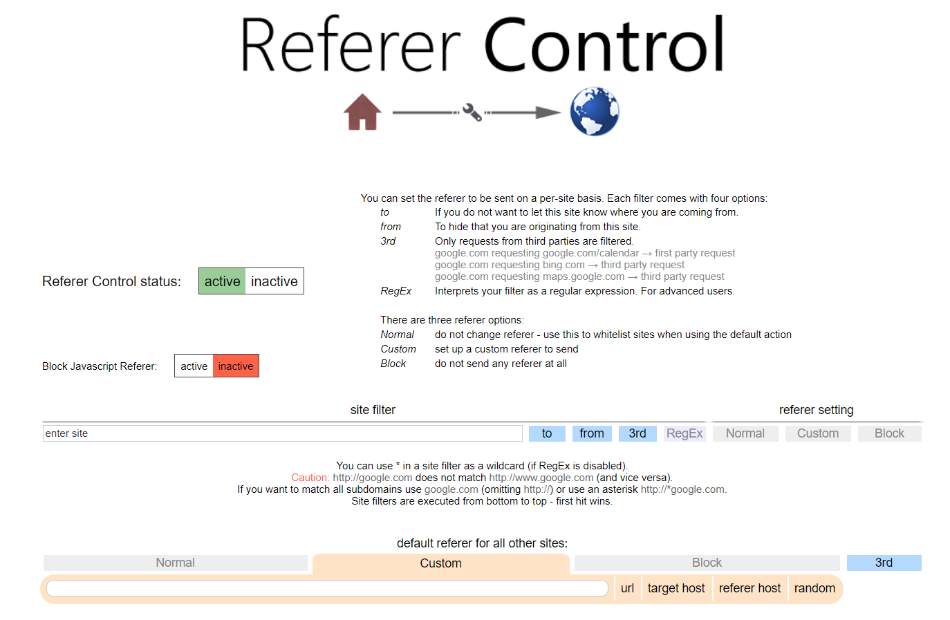 설치한 뒤 확장 프로그램을 키면 다음과 같은 화면이 나오는데, Custom을 눌러 원하는 대로 Referer을 지정해주면 된다.