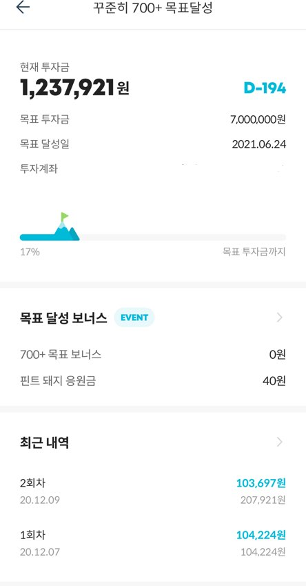 꾸준히 700+ 목표달성 현황입니다. 금요일에 주는 핀트 돼지 응원금은 40원밖에 되지 않습니다.. 이번주 수익보다는 많이 줬네요. 확실히 200일에 700을 모으기 위해 매주 20만원이 넘는 돈을 입금해야하여 직장인 소액투자로는 힘들긴 합니다. 하지만 그만큼 오히려 더 열심히 돈을 모을 수 있는 것 같습니다.