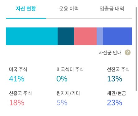 현재 제 자산 현황입니다. 미국 주식 41% 선진국 주식 13% 신흥국 18% 원자재/기타 5% 채권/현금 23%를 갖고있습니다. 미국 주식이 많이 오르길 기대하고 있어야 할것 같습니다.
