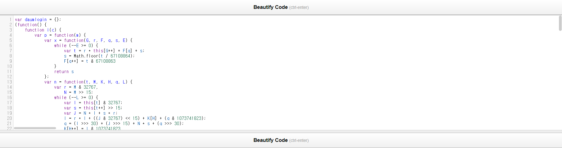 Crawling을 하다가 js를 분석해야 할 상황에서 js파일을 열어보면 다음과 같이 가독성이 매우 떨어지는 상황이 벌어지곤 한다.