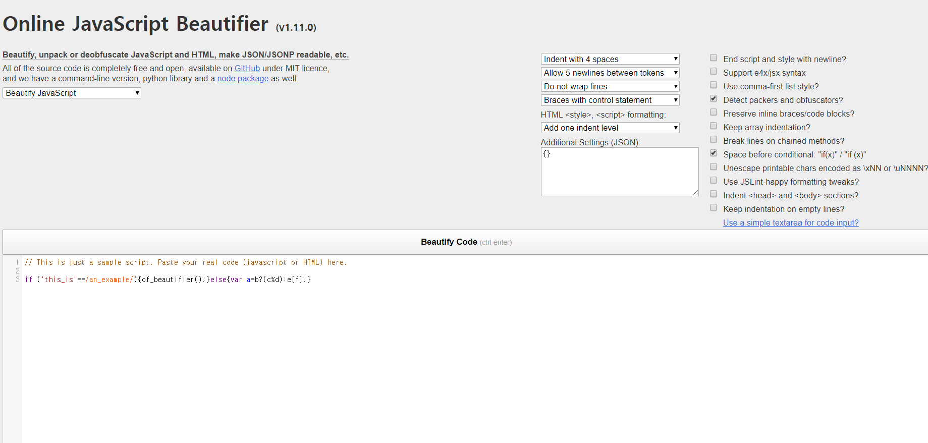 사이트 이름에서 알 수 있듯이 JS 파일을 이쁘게 만들어주는(가독성있게 만드는) 사이트이다.