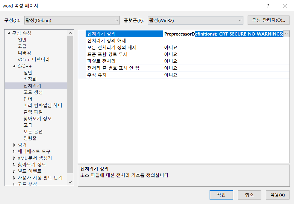 다음과 같이 세미콜론 뒤에 _CRT_SECURE_NO_WARNINGS를 추가하고 세미콜론을 붙여줍니다. 그리고 컴파일 하면 에러가 없어집니다.