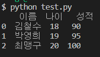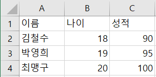 보통 파이썬으로 엑셀을 다룰 때 csv 모듈을 이용해 배열에 넣는것이 제일 쉽겠지만, 위의 경우처럼 이름에 해당하는 열, 나이에 해당하는 열, 성적에 해당하는 열처럼 가로가 아닌 세로형태일때 데이터를 다룰때는 pandas를 사용하는 것이 편리하고 좋은 프로그래밍 방식이 될 수 있습니다.